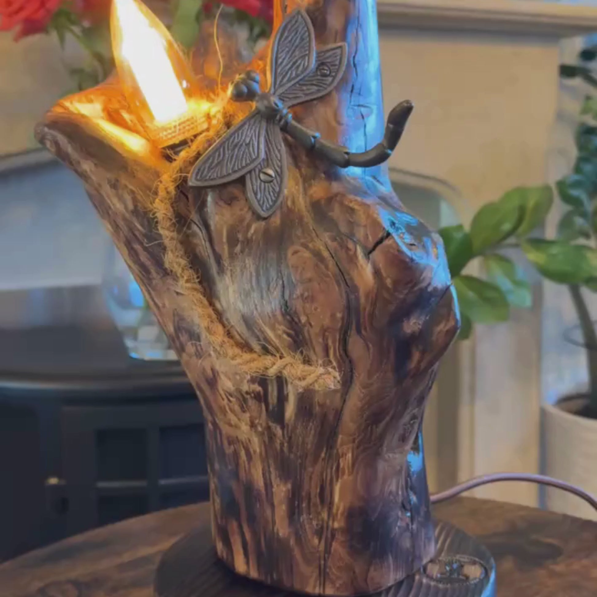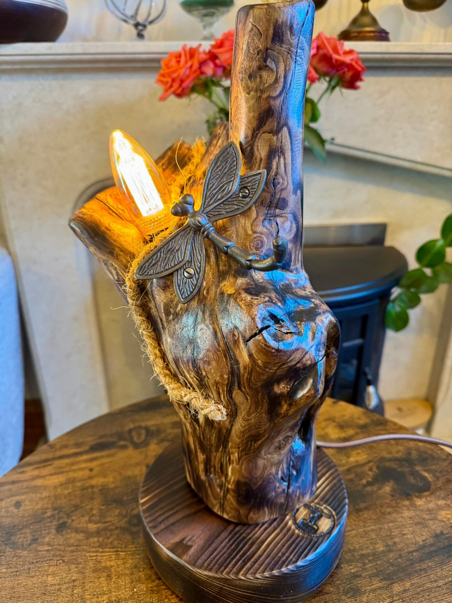 Apple Wood Lamp with Dragonfly Accent πͺ° β Unique Handmade Lighting