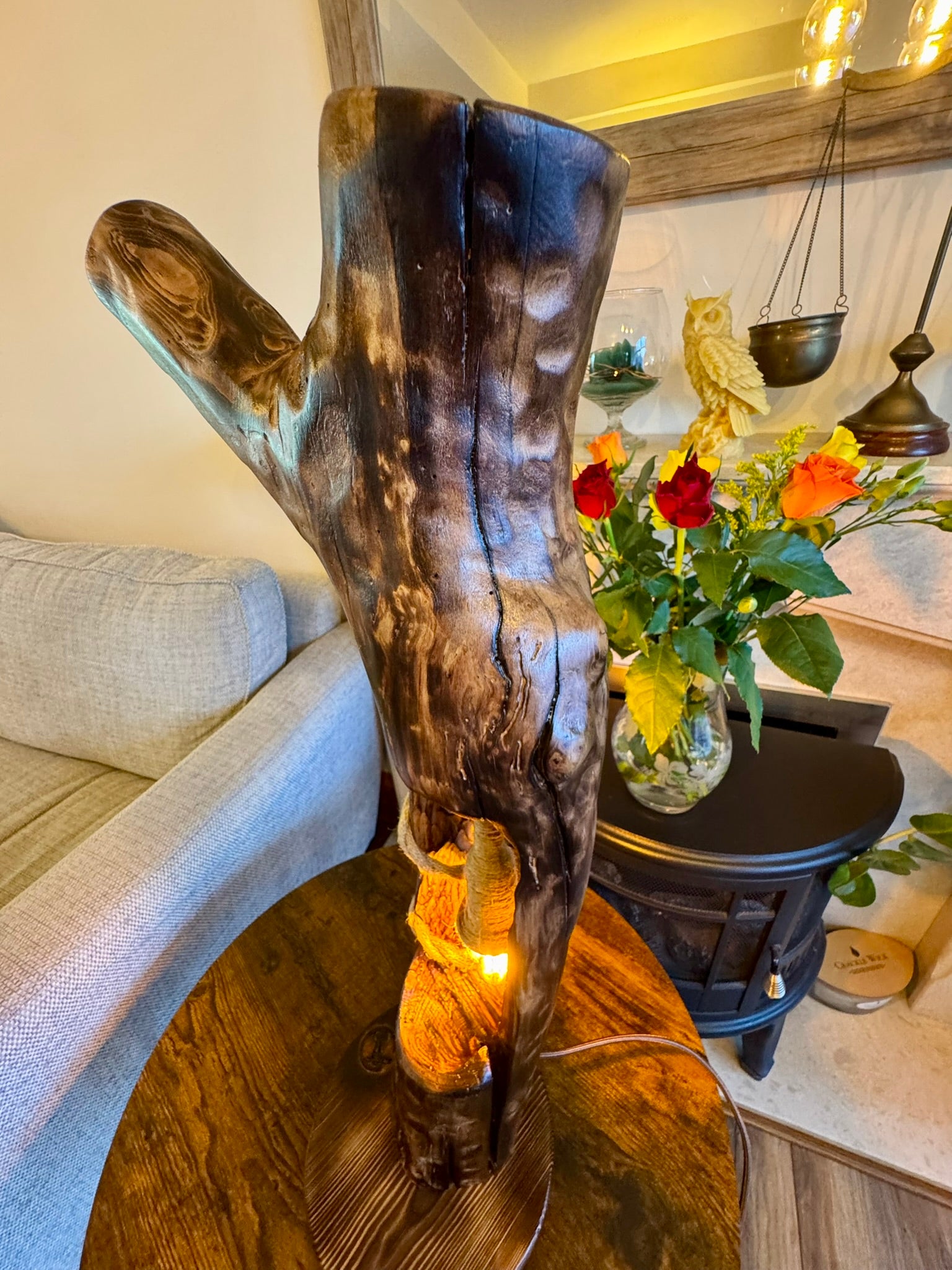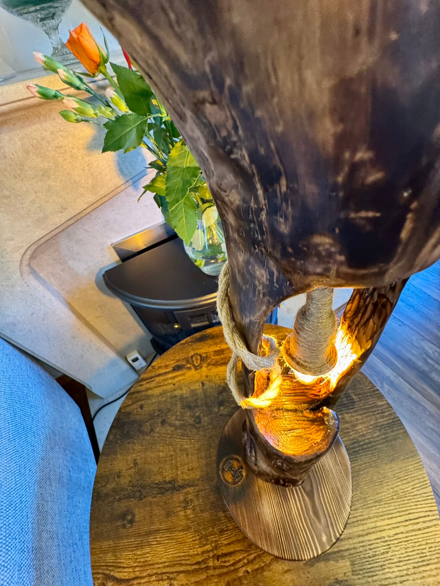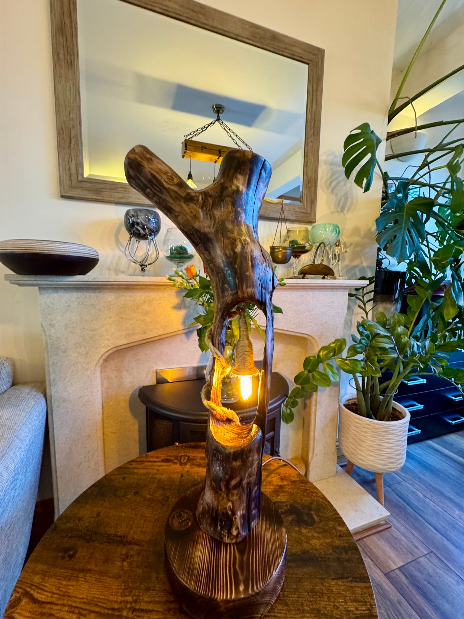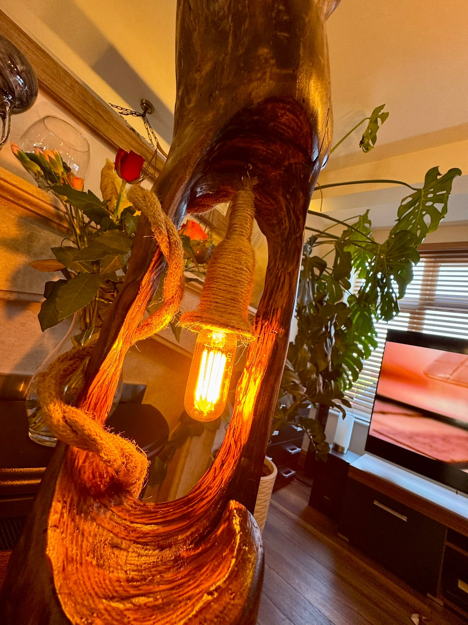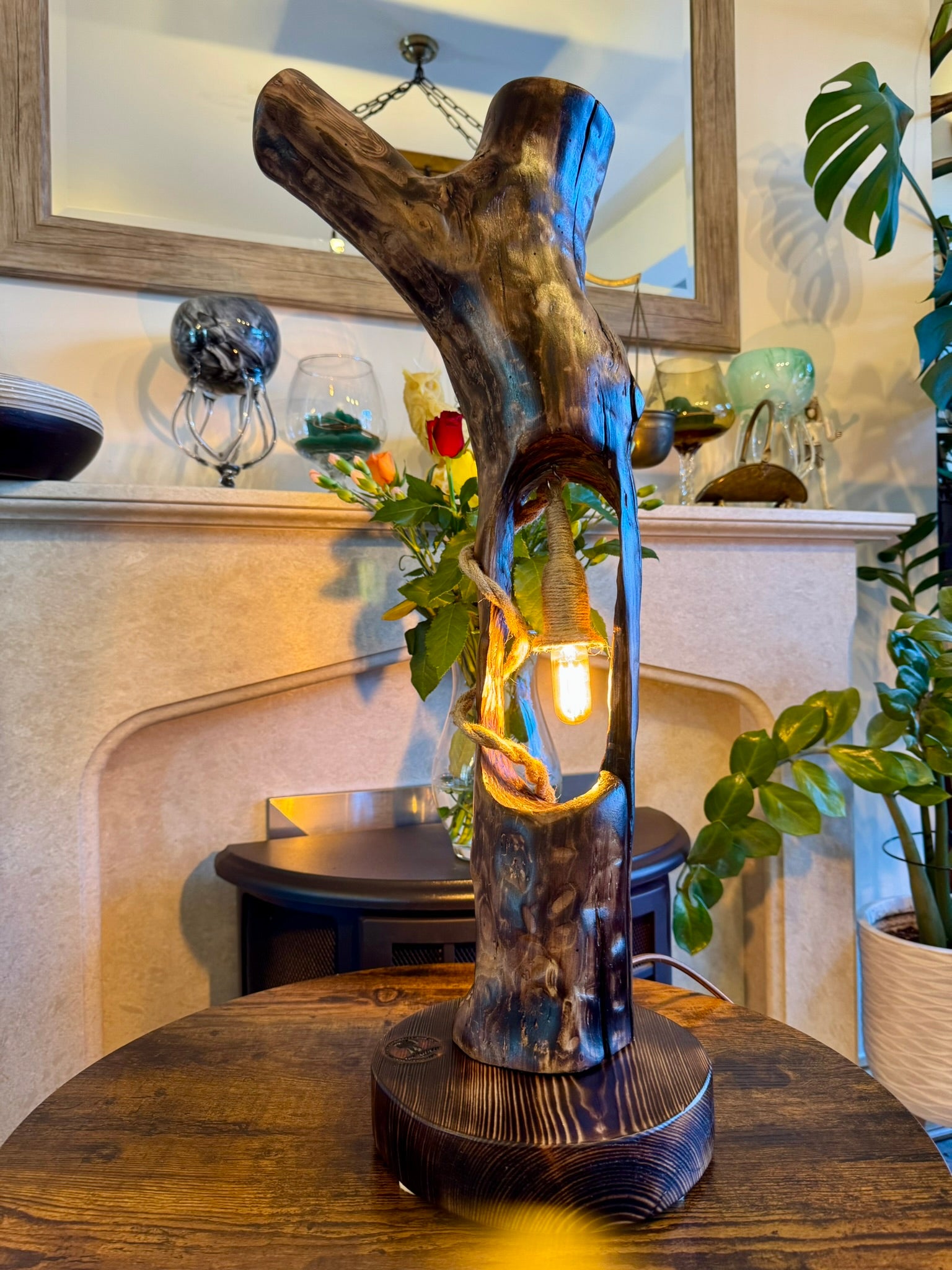 This stunning handcrafted wooden lamp features an organic tree-branch form with a beautifully hollowed-out center that cradles a glowing Edison bulb. Wrapped in rustic rope and finished with rich, natural textures, itβs more than just a lamp β itβs a sculpture that brings warmth and wonder to any room π₯β¨. Each piece is truly one of a kind, with its own character and story written in wood grain.