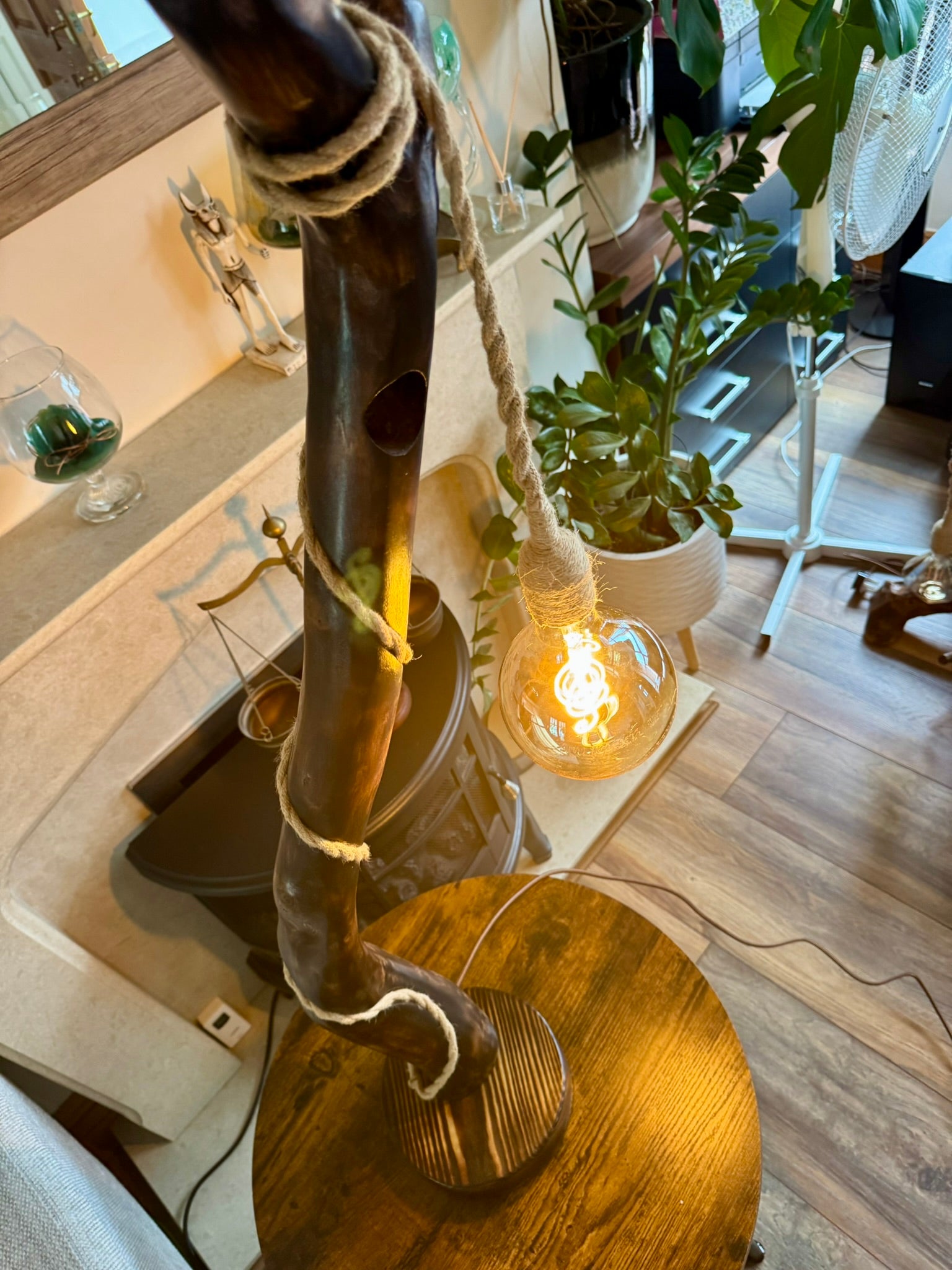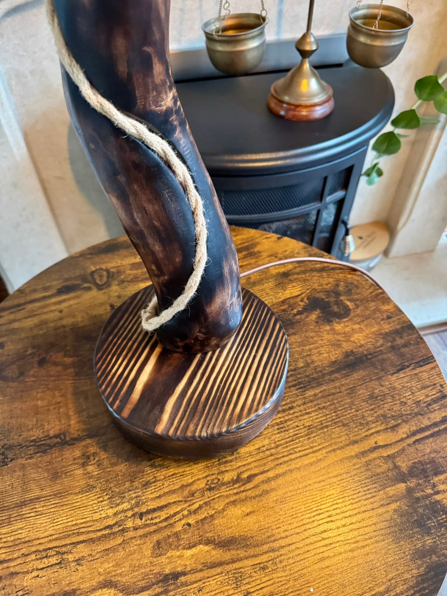 Add a bold statement to your interior with this elegant, handcrafted wooden lamp. Its tall, twisted design showcases the natural beauty of wood, enhanced by a deep, rich finish and a rustic rope accent that spirals gracefully around the base. The exposed filament bulb, suspended from a jute cord, emits a warm, golden glow—perfect for setting a cozy mood in any room. This piece blends rustic charm with artistic flair, making it a standout addition to modern, boho, or industrial spaces. Each lamp is a unique creation, celebrating nature’s raw beauty and expert craftsmanship.