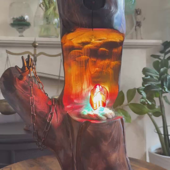 This handcrafted wooden lamp is more than a lighting piece — it's a striking work of art. With its bold, carved form, warm burnt finish, and glowing multicolor light nestled inside, it evokes mystery, depth, and warmth. A symbolic chain detail adds an expressive layer, making it ideal for interiors that celebrate uniqueness and creativity. Whether placed on a shelf, desk, or display stand, this lamp becomes the soul of any space. Each one is individually made, radiating meaning, character, and raw natural beauty.